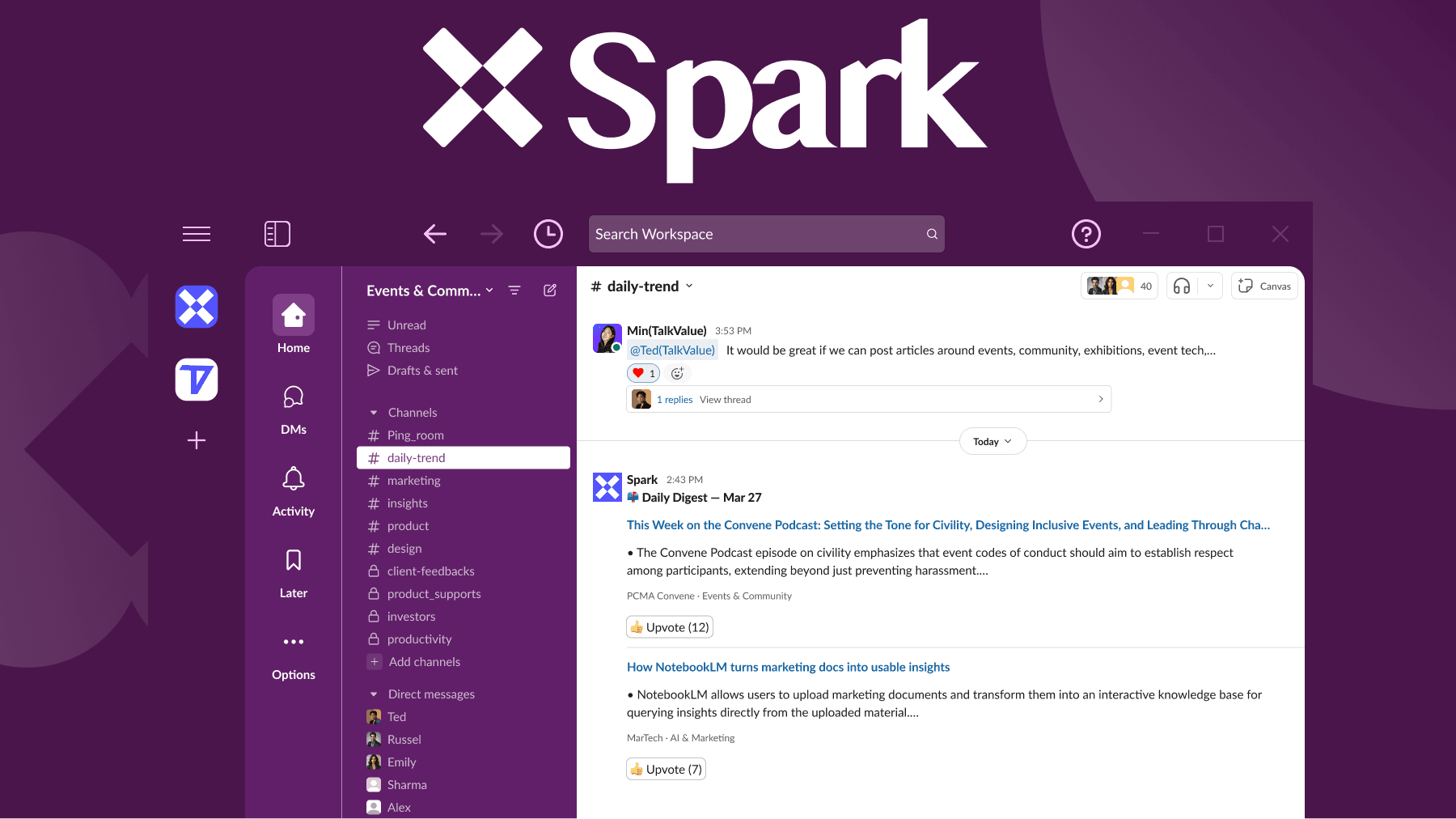 Your community Slack is quiet and you're tired of being the only one posting. Spark scrapes what's trending in your industry every morning and posts it to your channel automatically. Your members react, vote, discuss. You just watch what they care about.